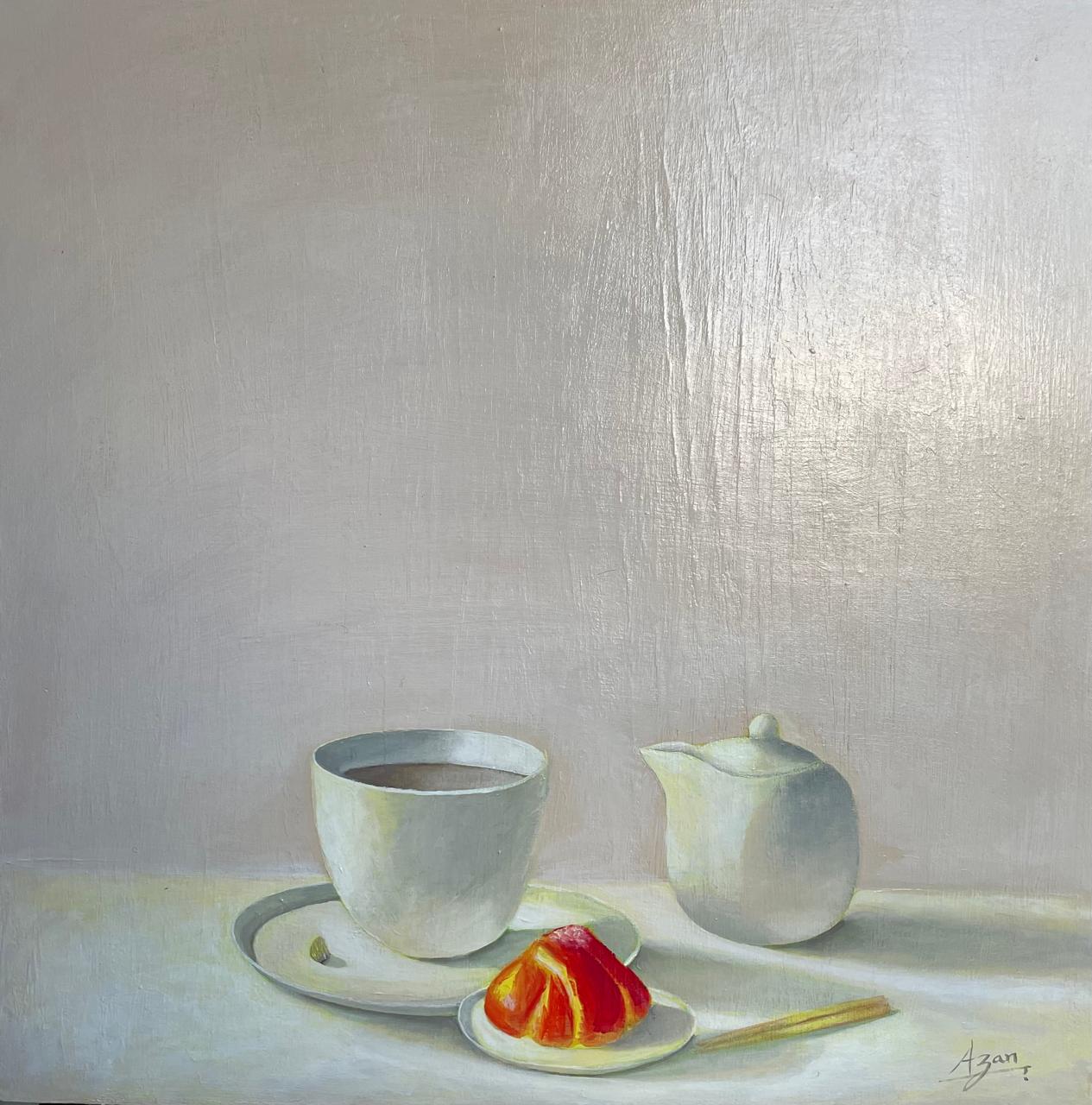 The artist here plays on the purity of forms and the subtle balance of neutral tones, broken only by the vivid burst of orange, like a sensory offering. The whole invites contemplation, slowing down, and visual meditation. It’s less about breakfast than about a suspended moment, where ritual becomes poetry.